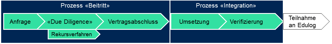 Der Beitritt eines SP zu der Föderation Edulog wird durch seine Integration in die technische Infrastruktur der Föderation umgesetzt. Die Integration wird durch die Geschäftsstelle Edulog ausgelöst und vom technischen Betrieb (ELCA) in Zusammenarbeit mit der Kontaktperson technisch des SP durchgeführt.